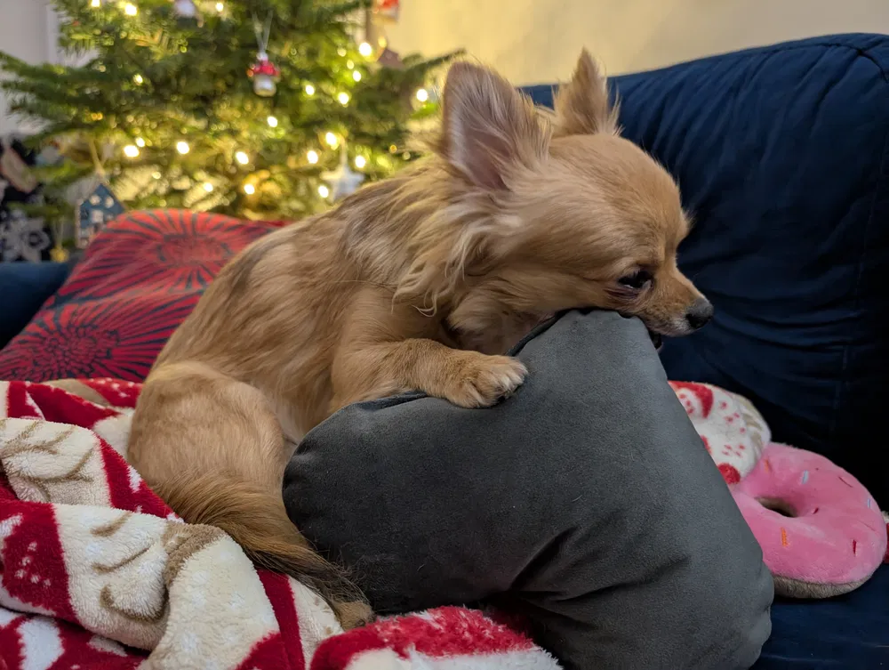 Diamon i jego nowy pokrowiec na legowisko od KryKas (nowy kolor – ciemnobrązowy)